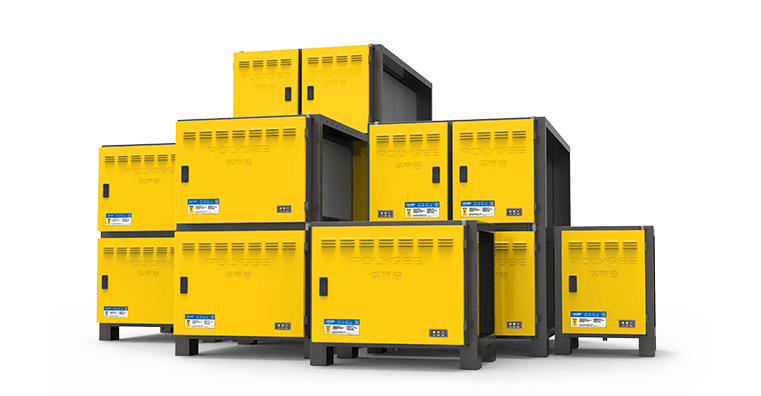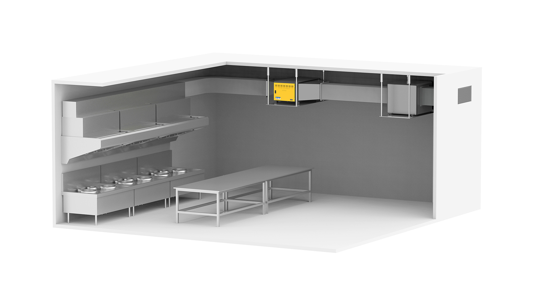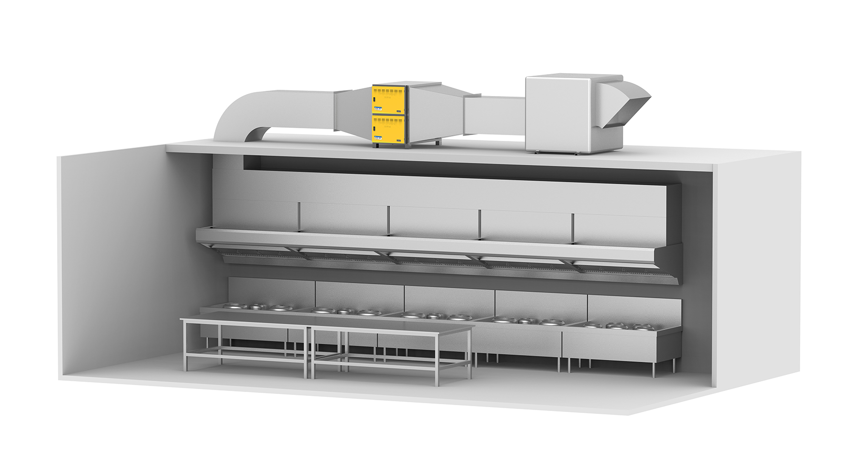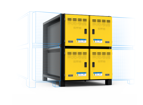 油烟首先通过前置过滤器,大颗粒物被滤除;接着进入高压电离区,油烟中的颗粒被电离并带上正电荷或负电荷;吸附区由很多平行极板组成, 通以高压直流电形成均匀电场,带电颗粒被接地板吸引的同时也受到带电板驱赶,被高效去除。